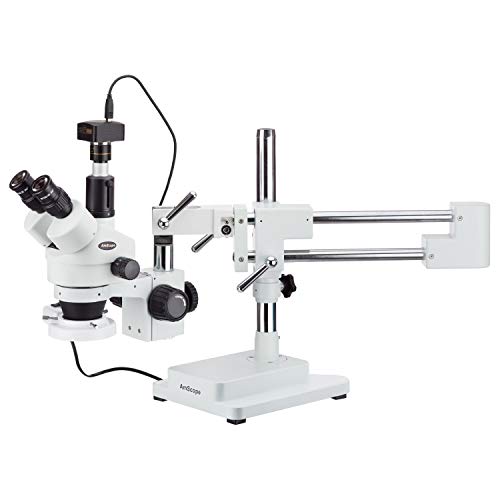 AmScope SM-4TPZ-FRL-3M Digital Professional Trinocular Stereo Zoom Microscope with Simultaneous Focus Control, WH10x Eyepieces, 3.5X-90X Magnification, 0.7X-4.5X Zoom Objective, 8W Fluorescent Ring Light, Double-Arm Boom Stand, 110V-120V, Includes 0.5X an