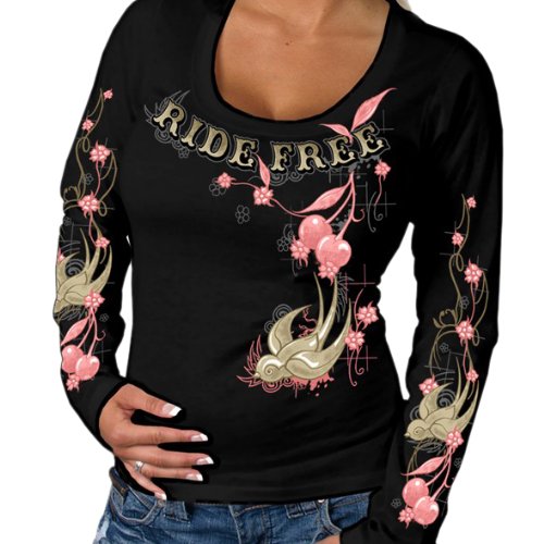 Hot Leathers Cherries Scoopneck Ladies Long Sleeve Tee - Junior Cut (Black, Large)