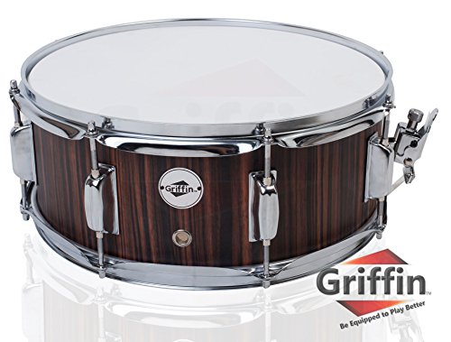 Snare Drum by Griffin | Black Hickory PVC Glossy Finish on Poplar Wood Shell 14" x 5.5" | Percussion Musical Instrument with Drummers Key for Students & Professionals | 8 Lugs & Deluxe Snare Strainer