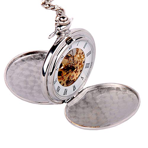 ShoppeWatch Skeleton Pocket Watch Mechanical Movement Hand Wind Full Hunter Silver Tone Engravable Ideal as Groomsmen Watches PW20