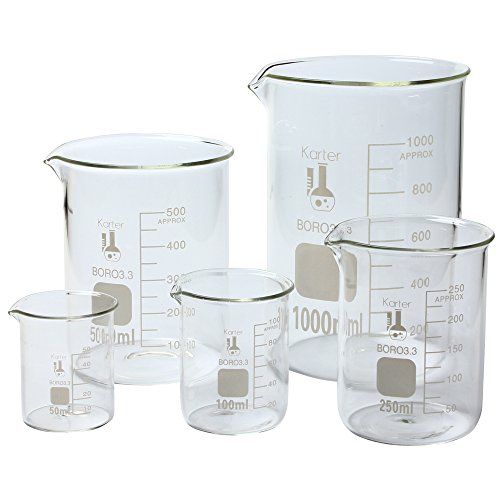Karter Scientific 213A2 Borosilicate Glass Low Form Glass Beaker, 50/100/250/500/1000 mL (Pack of 5)