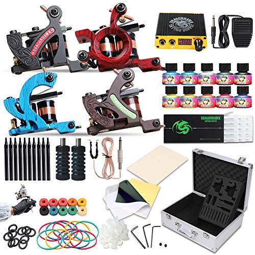 Dragonhawk Complete Tattoo Kit 4 Standard Tunings Tattoo Machines Power Supply 10 Color Immortal Tattoo Inks 50 Needles Tips Grips with Case D139GD