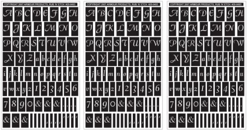 Armour Products Rub n' Etch Glass Etching Stencils 5 inch x 8 inch 3 Pack Script Letters and Numbers 12-7032