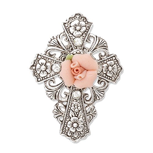 Silver-tone, Pink Porcelain Rose Cross Pin - Perfect Religious Gift