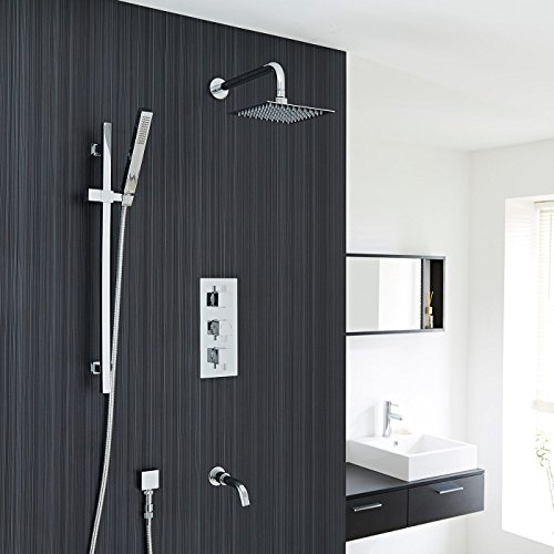 Hudson Reed Thermostatic Shower System With Triple Divertor Valve, 8" Square Rainfall Head, Rail Kit, Handspray & Tub Filler In Chrome