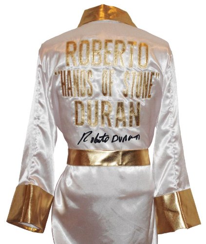 Roberto Duran Signed White Robe"HANDS OF STONE" on back - Autographed Boxing Robes and Trunks