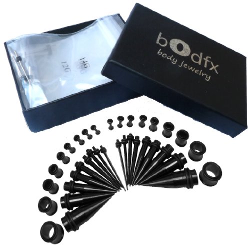 36 Piece NIGHT BLACK TITANIUM Ear Taper Stretching Kit & Single Flare Anodized Tunnel Set. 00g-14g