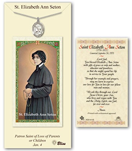 Pewter St. Saint Elizabeth Ann Seton medal on an 18in Stainless Silver Lite Curb Chain with a Prayer to St Elizabeth Anne Seton Prayer Card Medal Pendant Necklace.