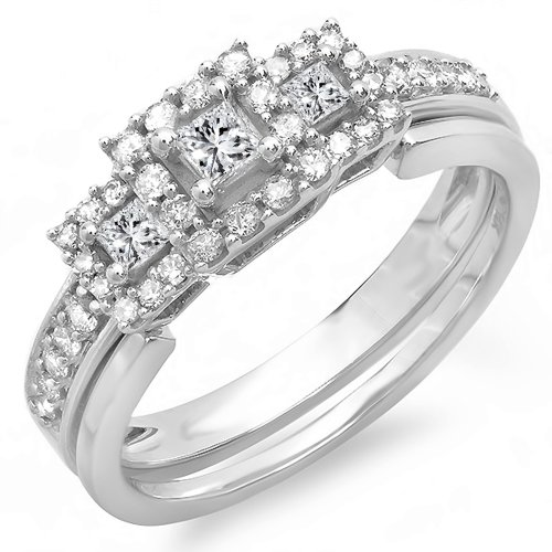 Dazzlingrock Collection 0.55 Carat (ctw) 14k Round & Princess Diamond 3 stone Ladies Engagement Ring Wedding Band Set, White Gold