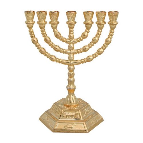 7 Branch Hexagonal Base 12 Tribes of Israel Menorah in Gold