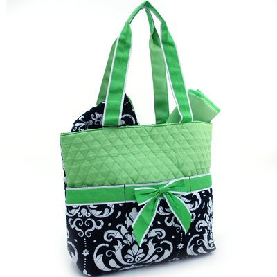 Quilted Green Damask Floral Print Diaper Bag Change Pad and Cosmetic Bag