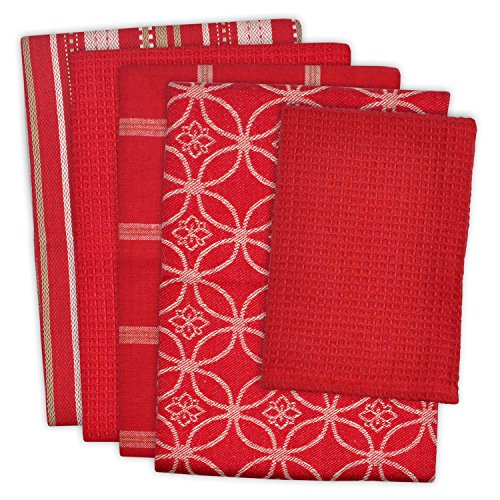 DII Cotton Oversized Kitchen Dish Towels 18 x 28" and Dishcloth 13 x 13", Set of 5 , Absorbent Washing Drying Dishtowels for Everyday Cooking and Baking-Red