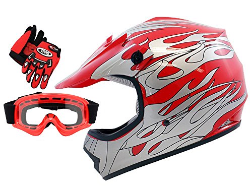 TMS Youth Kids Red Flame Dirt Bike ATV Motocross Helmet with Goggles and Gloves (Medium)