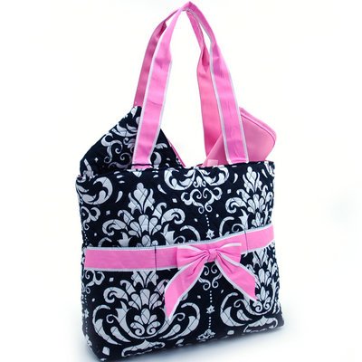 Quilted Damask Print 3 pc Set Diaper Bag w/ Changing Pad & Cosmetic Bag (Black & White w/ Pink Trim)