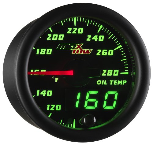 MaxTow Double Vision 280 F Oil Temperature Gauge Kit - Includes Electronic Sensor - Black Gauge Face - Green LED Illuminated Dial - Analog & Digital Readouts - For Trucks - 2-1/16" 52mm