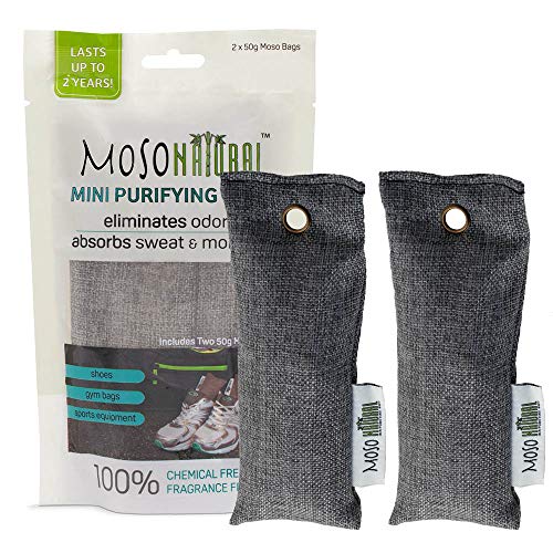 MOSO NATURAL Mini Air Purifying Bag Shoe Deodorizer. Odor Eliminator for Gym Bags, Sneakers and Sports Gear Charcoal Color 2 pack