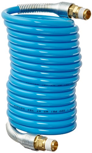 Legris Nylon 12 Self-Recoiling Hose Assembly with Brass Swivel Fittings, Blue, 1/4" OD, 220 psi, 10 feet Working Length