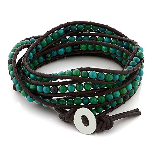 Gem Stone King 28inches Blue/Green Beads on Dark Brown Leather Wrap Bracelet with Snap Button Lock