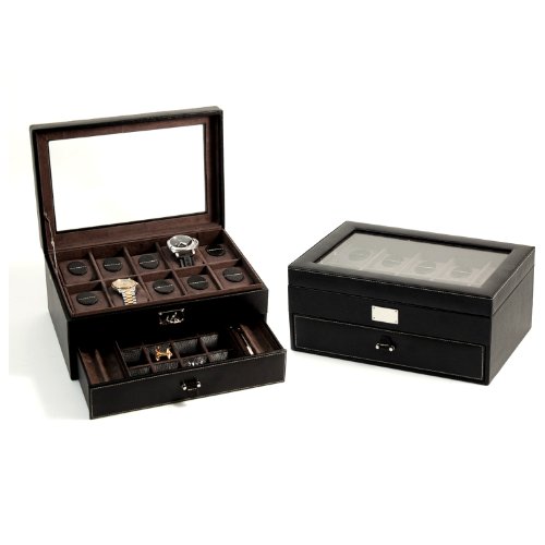 Leather 10 Watch Case With Glass Top, Drawer For Cufflinks And Pens, Black