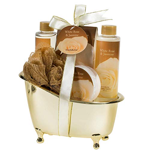 Luxurious White Rose Jasmine Spa Gift Set For Women Displayed In Elegant Gold Tub Includes: Shower Gel, Bubble Bath , Body Lotion, Jasmine Bath Salt and Pouf, Award Winning Bath and Body Gift Set