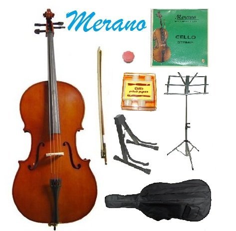 MERANO BRAND 4/4 Size Natural Cello with Bag and Bow+Rosin+Extra Set of MERANO Brand Strings+Tuner+Cello Stand+Music Stand