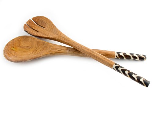 Maisha Fair Trade African Wooden Salad Servers Set Ladle Cooking Spoon & Fork Utensils Teak Wood Round Batik Zig Zag Bone Handle