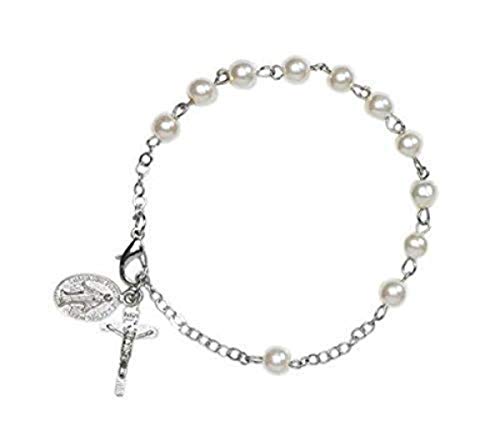 CB 6MM Ivory Simulated Imitation Pearl Bead Rosary Bracelet with Miraculous Medal Charm, 7 3/4 Inch