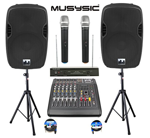 Complete Professional 2000 Watts Complete PA System 6 Ch Mixer 10" Speakers Dual Wireless Mics Stand