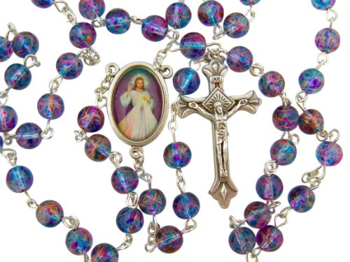 CB Silver Plated 7MM Multi Color Glass Bead with Divine Mercy Centerpiece Rosary Necklace, 18"