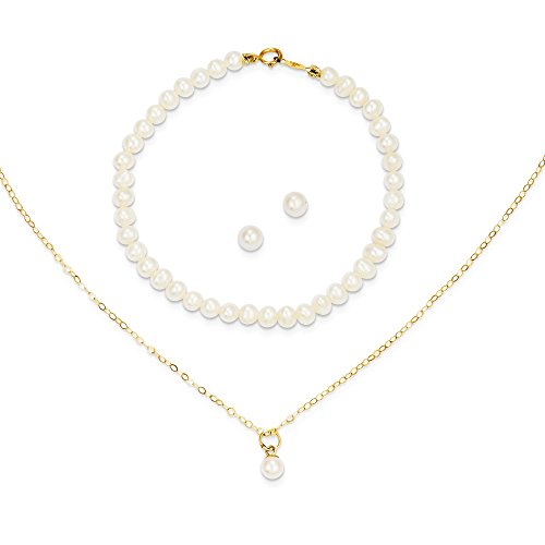 JewelryWeb 14k Yellow Gold Polished Spring Ring Post Earrings Freshwater Cultured Pearl for Boys or Girls 15inch Necklace Earrings and 5.5in Bracelet 3pc Set