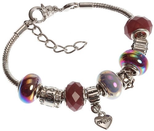 Mother's Charm Bracelet with Removable Pandora Compatible Italian Murano Glass Beads for Moms in Chameleon Purple, 7" + 1" Extender