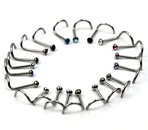 CrazyPiercing 20pcs Colorful Rhinestone Steel Screw Nose Rings Studs Bar Pin Piercing Jewelry (20 pcs)