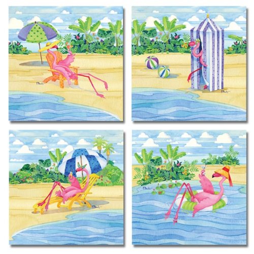 Gango Home Decor's Beach Collection - Pink, Blue and Green Humorous Oceanside Flamingos by Paul Brent; Coastal Decor; 4 - 12x12" Unframed Paper Posters