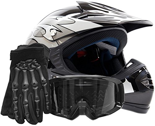 Typhoon Youth Kids Offroad Gear Combo Helmet Gloves Goggles DOT Motocross ATV Dirt Bike Motorcycle Silver Black - Large