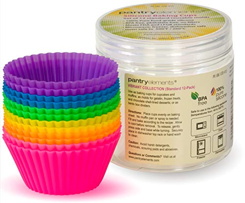 Pantry Elements Silicone Cupcake Liners Baking Cups - 12 Pack Vibrant Muffin Cake Molds in Bonus Screw Top Storage Jar
