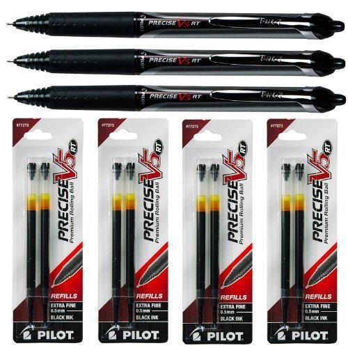 Pilot Precise V5 Rt, 3 Pens 26062 with 4 Packs of Refills, Black Ink, 0.5mm X-fine