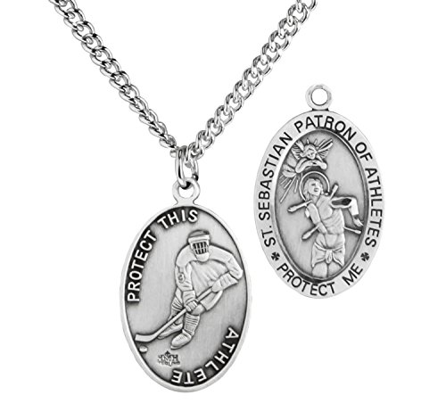 Men's Sterling Silver Oval Saint Sebastian Ice Hockey Medal + 24 Inch Endless Rhodium Plated Chain