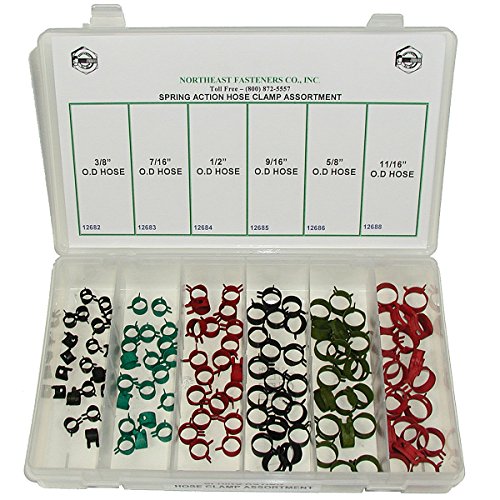 Northeast Fasteners Spring Hose and Tube Clamp Assortment, 120 Piece Steel Multi Diameter Color Coded Spring Action Clamp Kit with Plastic Organizer