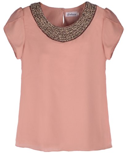 Quality Embellished Bead Collar Ruffle Shoulder Tops T-Shirts Blouse, Pink 8P