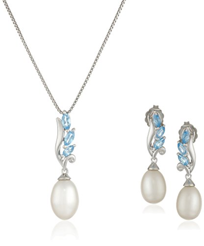 Sterling Silver Swiss Blue Topaz and Freshwater Cultured Pearl Necklace and Earrings Jewelry Set