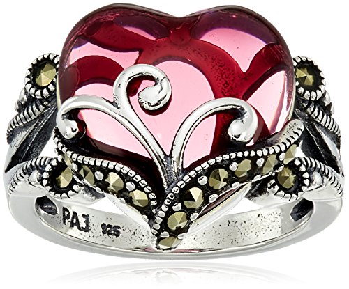 Sterling Silver Oxidized Marcasite and Gemstone Colored Glass Filigree Heart Ring, Size 7