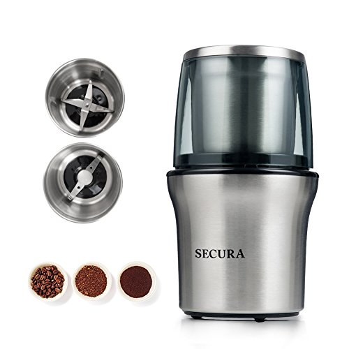 Secura Electric Coffee Grinder & Spice Grinder with 2 Stainless-Steel Blades Removable Bowl (1-Year Warranty)