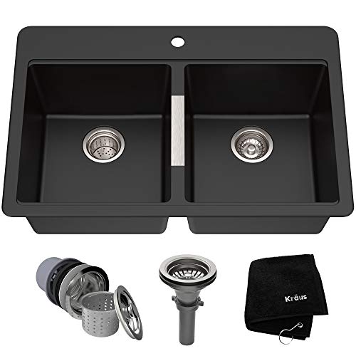 Kraus KGD-433B 33 1/2 inch Dual Mount 50/50 Double Bowl Black Onyx Granite Kitchen Sink