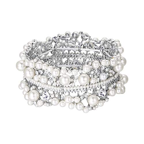 EVER FAITH Austrian Crystal Simulated Pearl Bridal Flower Stretch Bracelet Clear Silver-Tone