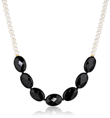 Black Onyx and White Freshwater Cultured Pearl Strand Necklace, 16" with 2" Extender