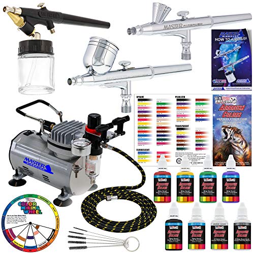 3 Airbrush Professional Master Airbrush Multi-Purpose Airbrushing System Kit with 6 Primary Opaque Colors Acrylic Paint Artist Set - G22, G25, E91 Gravity & Siphon Feed Airbrushes and Air Compressor