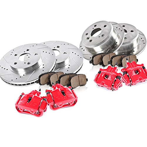 FRONT + REAR Powder Coated Red [4] Calipers + [4] Rotors + Quiet Low Dust [8] Ceramic Pads Performance Kit