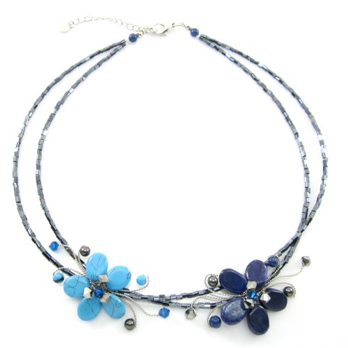 MGD, Swarovski Crystal with Blue Turquoise Color Bead and Lapiz Lazuli Color Bead Flowers / Floral Choker Necklace, Beautiful Handmade Necklace, Fashion Jewelry for Women, Teens and Girls, JA-00110N