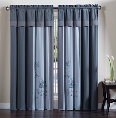 Chezmoi Collection 4-Piece Embroidered Floral Window Curtain Set with Tassels, Gray Blue