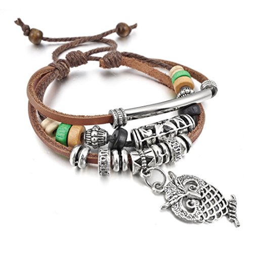 INBLUE Women's Alloy Genuine Leather Bracelet Bangle Rope Brown Owl Surfer Wrap Tribal Adjustable